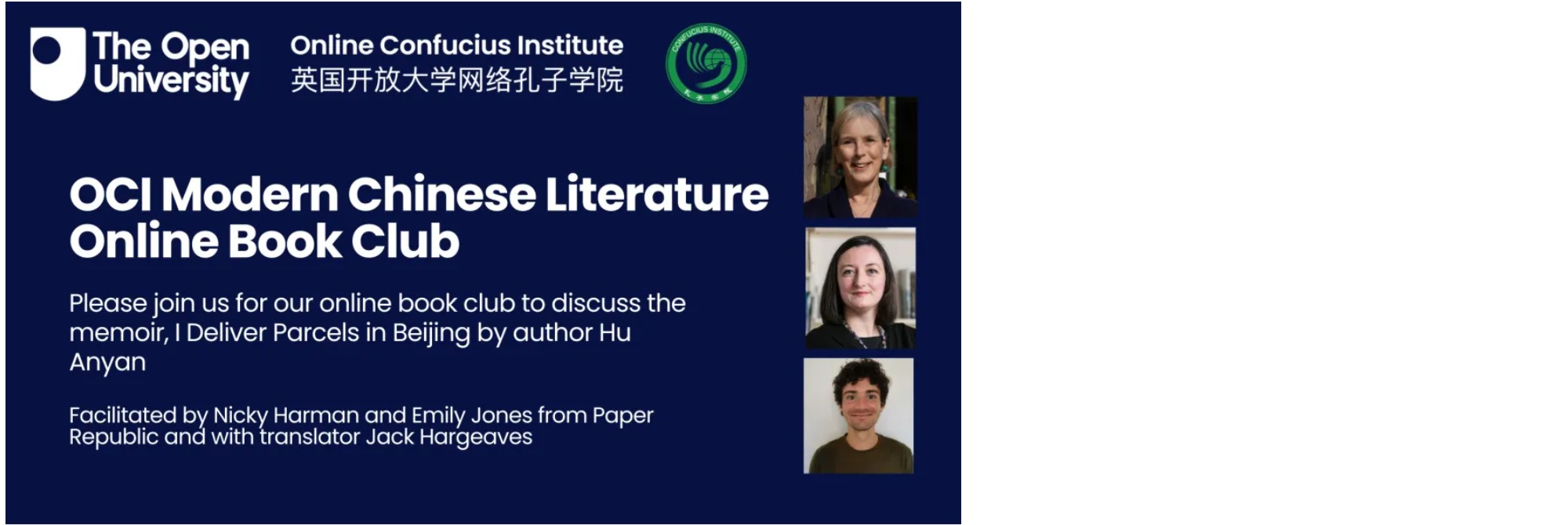 Join us for our next Open University Confucius Institute event, a discussion of Hu Anyan's novel, I deliver parcels in Beijing. The discussion, led by translator Jack Hargreaves and facilitated by Nicky Harman and Emily Jones, takes place online on Friday 1st May, at 13:00 – 14:00 UK time. Platform: Microsoft Teams. Discussion language: English.